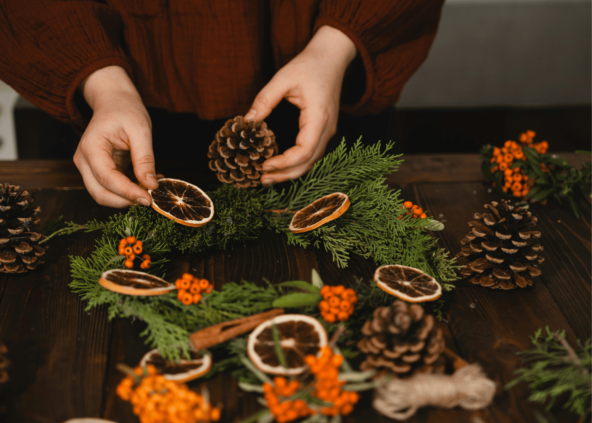 Woman arranging pinecones, dried oranges, and evergreen sprigs to create a handmade holiday wreath. This image captures the warmth of the season, the joy of crafting, and the creative courage to make something beautiful by hand—reflecting the spirit of mixed media art and brave self-expression.